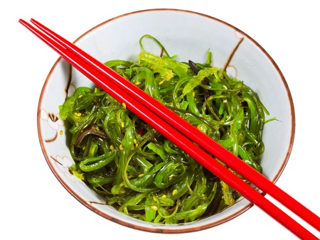 食べる中華サラダ 海藻サラダは 白い背景で隔離赤い箸でボウルにゴマを振りかけた の写真素材 画像素材 Image